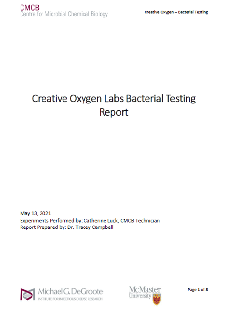 McMasters Center for Microbial and Chemical Biology (CMCB) at the Michael G. DeGroote Institute for Infectious disease center affirms that after carrying out tests in accordance with the Kirby-Bauer halo and ISO 22196, Oxygen coating has antibacterial capabilities. When the lab tests were carried out in two time lines and on three sets of sample surfaces it was evident that the halo effect (or immunity shield) around the coated area showed no signs of bacteria penetration (99% kill rate) or growth while the control samples did not offer any bacterial protection as evidence of Oxygen coatings effectiveness.